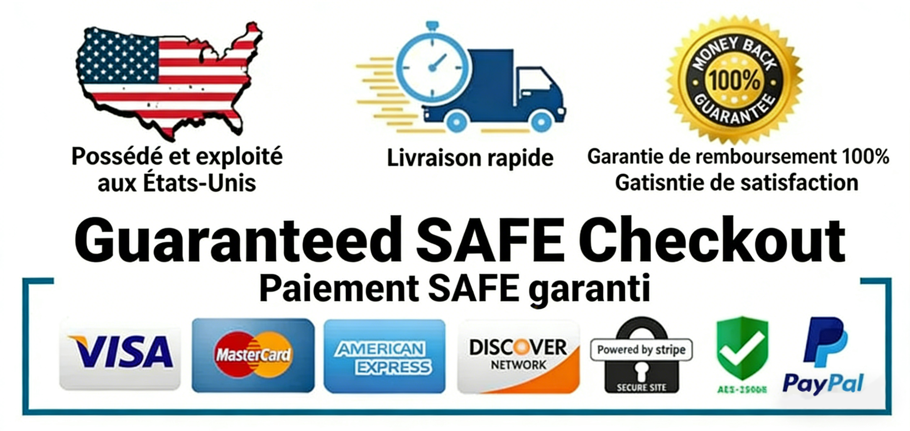 Le processus de paiement est garanti à 100 % sûr et sécurisé avec Visa, Mastercard, AMex, Discover, Apple Pay ou PayPal.