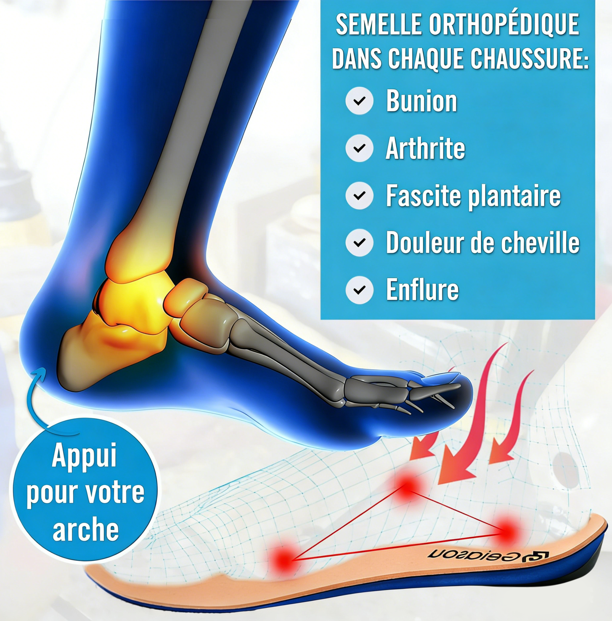 Notre semelle de cushioning ergonomique réduit tout impact qui se produit après avoir fait un pas.